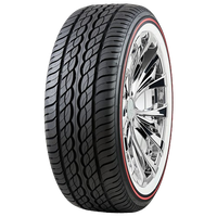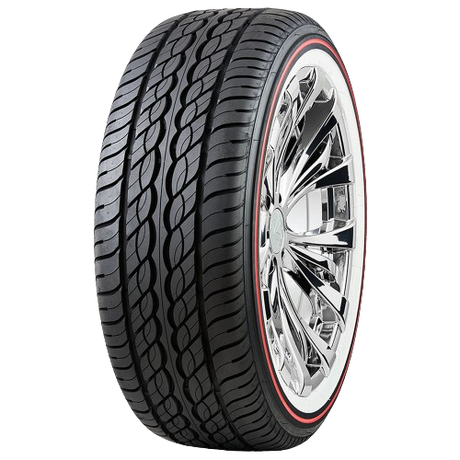 In addition, the deep grooves of the Vogue Custom Built Radial XIII Red Stripe expel water and slush from the footprint. Combined with Vogue's Aqua Tread Block Design, they significantly reduce the risks of slippage and aquaplaning on wet roads. The highlight of this model is its elegant sidewall design. The white sidewalls feature a stylish red stripe to make your car stand out in traffic. Also, the sidewalls combat lateral forces at higher speeds, boosting steering accuracy. With its advanced rubber compound, this tire offers a low rolling resistance, which decreases fuel use for the car. At last, this model is available for purchase in sizes with a rim diameter of 24" and a speed index of H (130 mph).